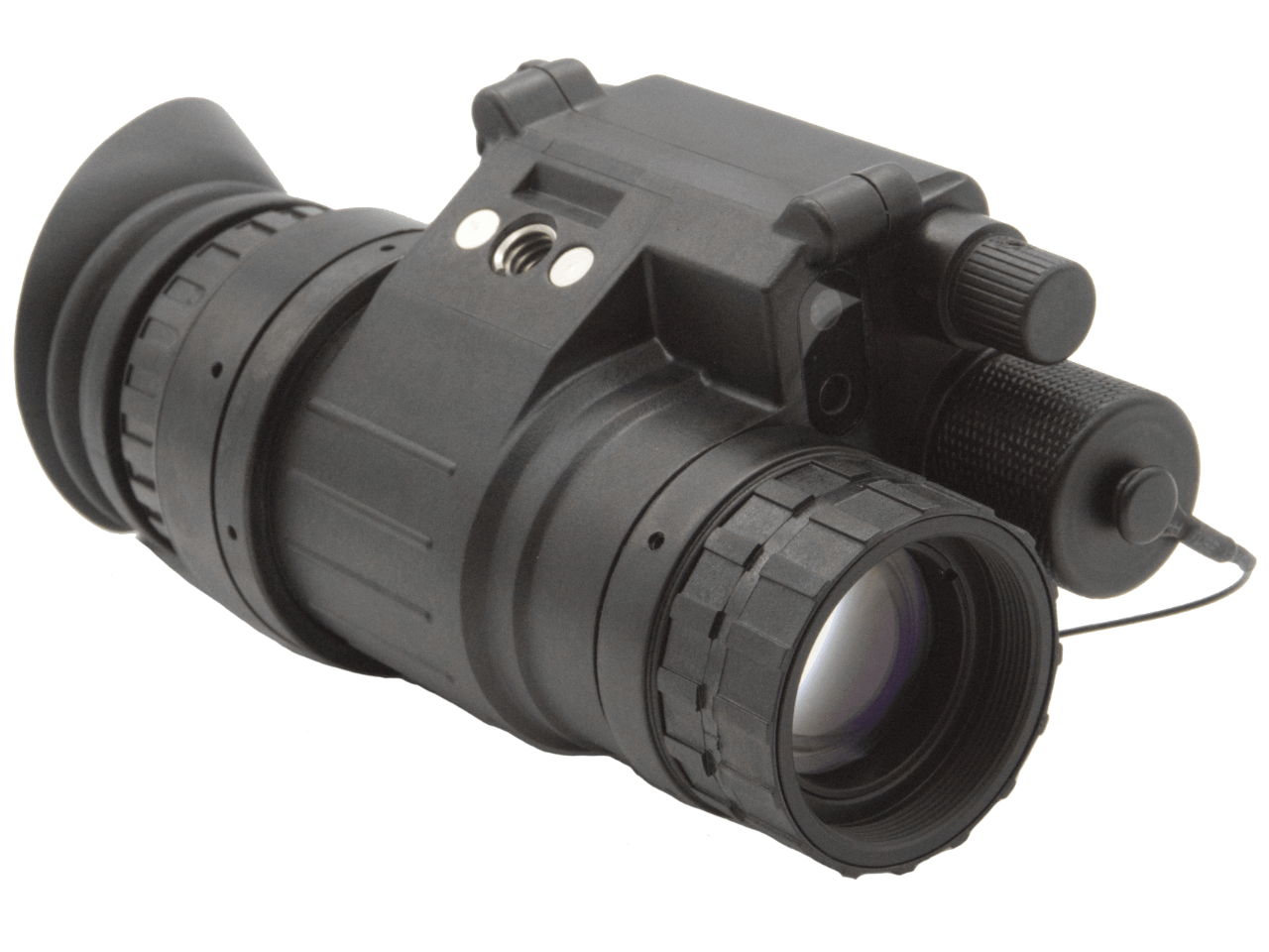 The PVS-14 provides controls for a built‐in short-range IR illuminator, automatic high light cut-off sensor, and “flip‐up” OFF magnetic feature switch. This system has durable, robust, and lightweight housing construction and provides the best balance between ergonomics and performance in the industry.